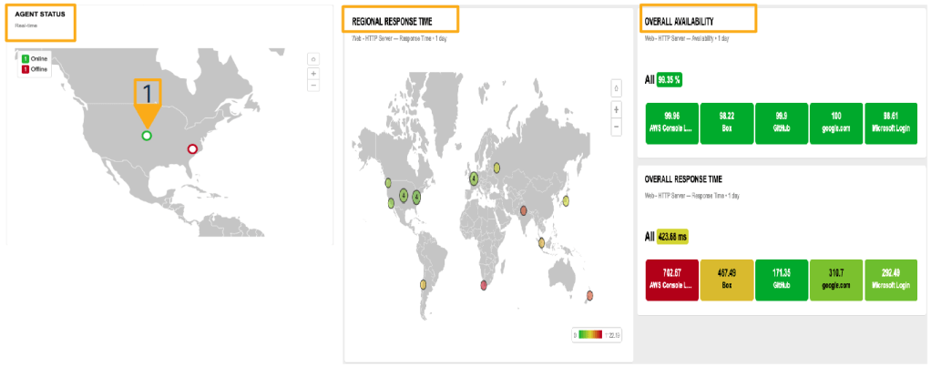 Enterprise Agent: realiza o monitoramento de dentro para fora, diretamente em seu ambiente local (on-premises). Ele oferece opções de implantação flexíveis, como OVA (Appliance Virtualizado), appliance físico, pacotes linux, docker e suporte a equipamentos Cisco ASR1k, ISR4k e CAT9K. Esse agente é comumente utilizado para monitorar aplicações internas.