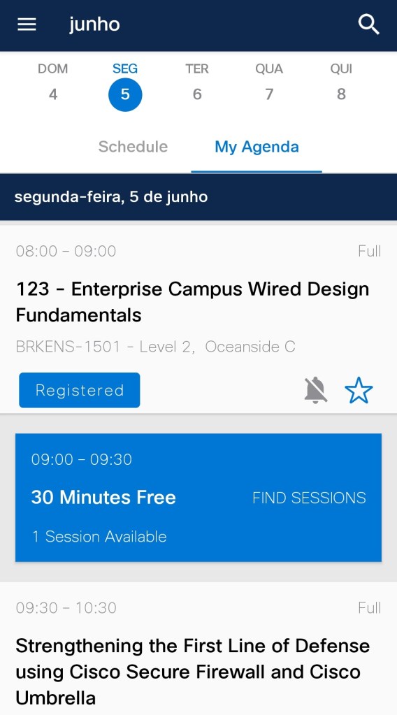 Vamos agora falar sobre o primeiro dia das palestras, onde selecionei duas apresentações e fiz um resumo do meu ponto de vista e opinião. O Cisco Live é, sem dúvida, o evento mais conectado e atualizado em termos de tecnologia do ano. Embora o local possa mudar de tempos em tempos, uma coisa é certa, as pessoas que participam são únicas! É como entrar em um caldeirão fervilhante, onde milhares de nerds, geeks e curiosos se reúnem para mergulhar de cabeça nas mais recentes tecnologias da Cisco. É uma celebração tecnológica, onde todos compartilham o desejo insaciável de aprender. Agora, vamos dar uma olhada como foi a nossa agenda.