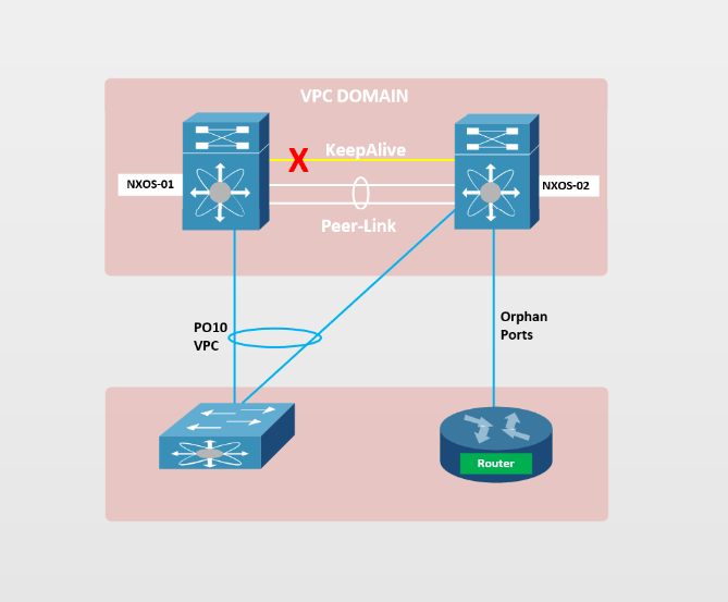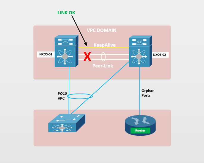 Falha no link keepalive: Durante uma falha no link do vPC de keepalive, não há impacto no fluxo de tráfego. Porém, se o link de keepalive ficar inoperante e após algum tempo o peer-link também falhar, ambos os membros do vPC agirão como vPC Primário.