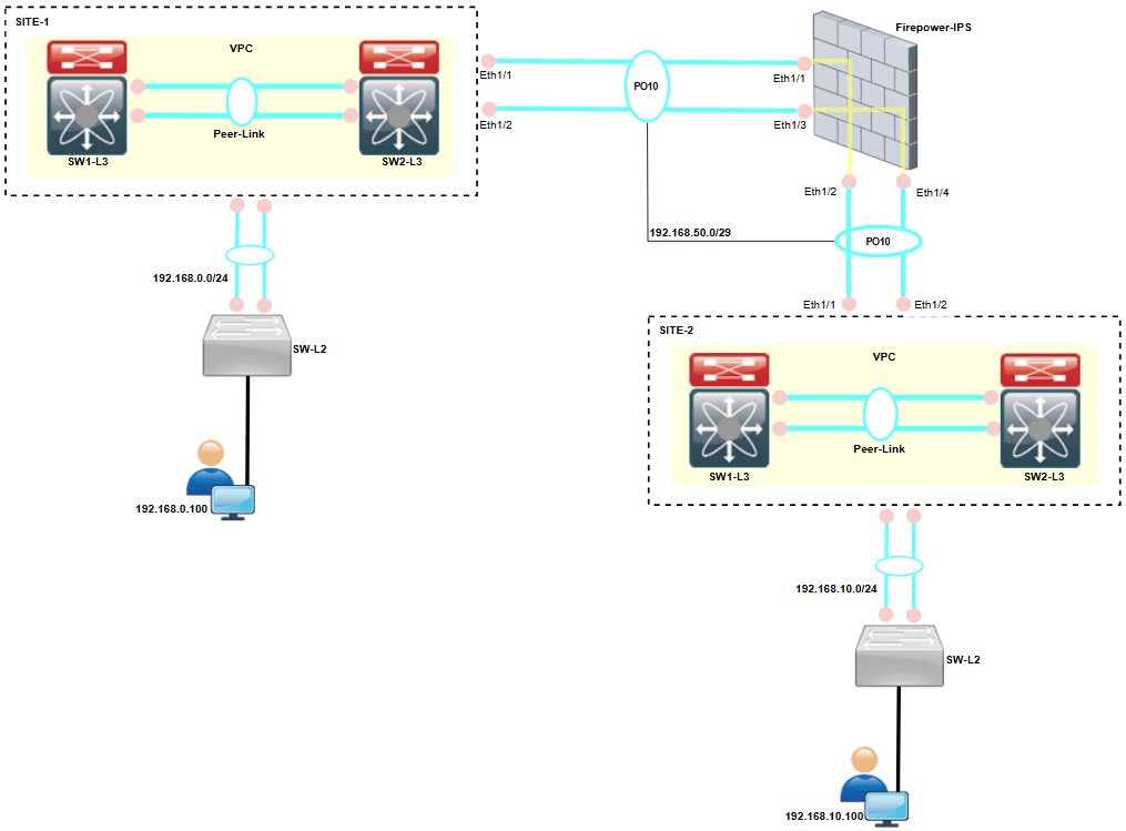 Neste cenário, o objetivo é inserir o FTD operando como IPS em modo inline entre os switches L3 do Site-1 e do Site-2, sem alterar a arquitetura de roteamento existente entre os ambientes.